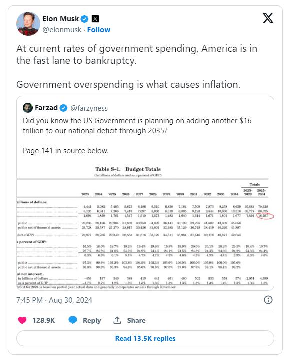 8 月 30 日,马斯克在 X 上分享了一名用户的帖子,该名用户在帖文中引用了对美国政府 2025 财年预算数据的预测,称美政府预算赤字可能会从目前的 18 亿美元增加到 2035 年的近 163 亿美元。
