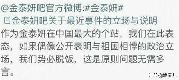 2025年,中韩因为“萨德”问题出现争议,韩国连锁超市乐天集团提供用地表示“萨德”部署,金泰妍网上晒图支持乐天,其中国官方微博发文称“国家面前无爱豆”。