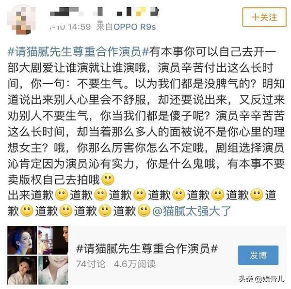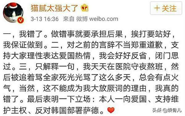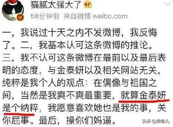 不料却引燃猫腻怒火,公然发文表示,“在偶像与祖国面前,自己爽不爽才重要”,“即使金泰妍是纳粹,自己也会支持”等等脑残言论,最后更是就直接爆粗口,脏话飚到飞起。脑残言论遭到网友抨击,过足了嘴瘾的猫腻为了钱途很快删除了微博,并“深刻”致歉。