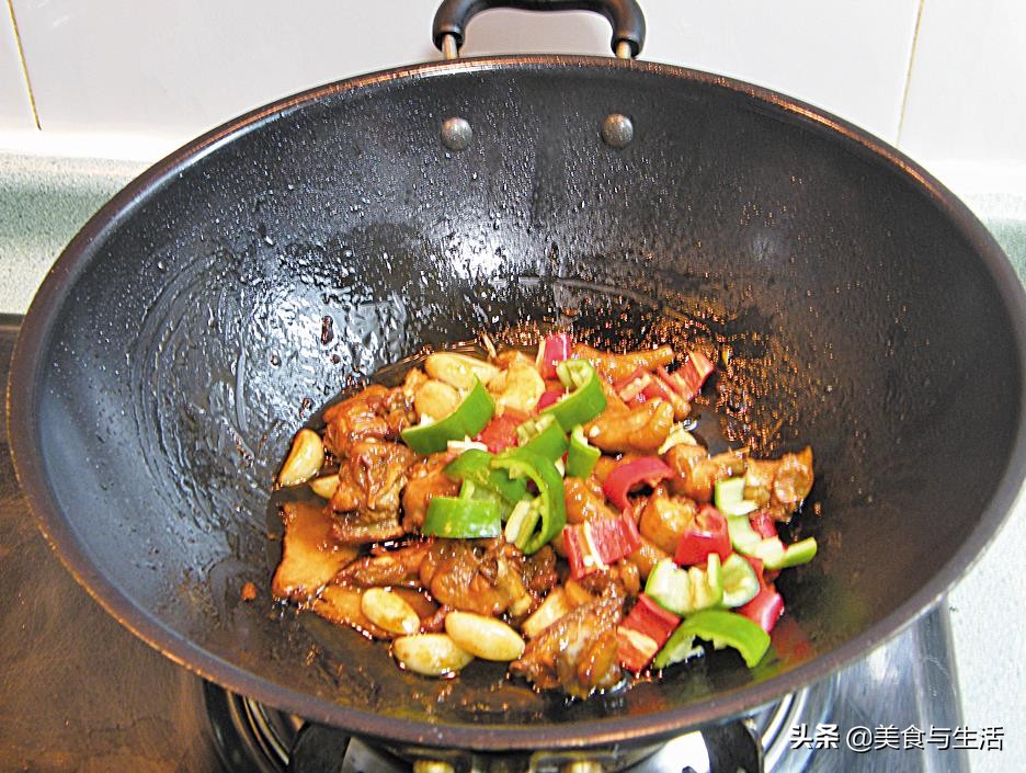 4.煮至汤汁剩1/4时,加入青、红椒块炒至断生、汤汁收干即可。