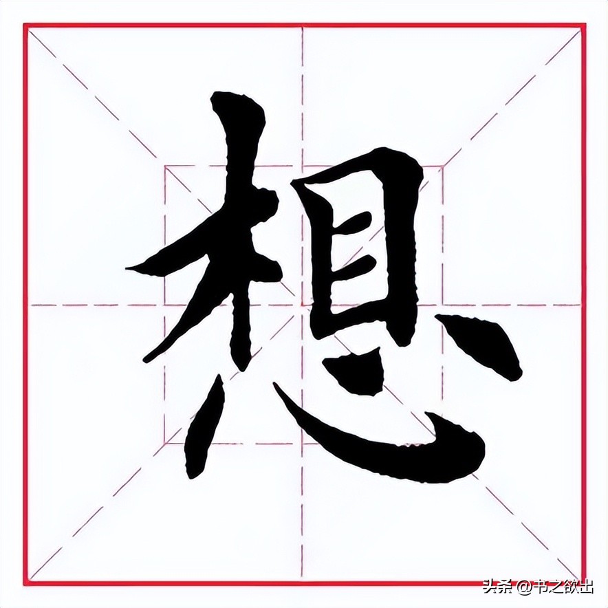 下部“心”字整体稍偏右,形扁。左点位于上方竖画左侧,角度稍立;卧钩起笔位于首横的收笔下方,露锋轻入,顺势向右下行,行笔渐重,先陡后平,行笔到位后再向左上方回锋挑笔出钩,钩身勿大;最后仰点与右点由低到高,笔断意连,互相呼应。