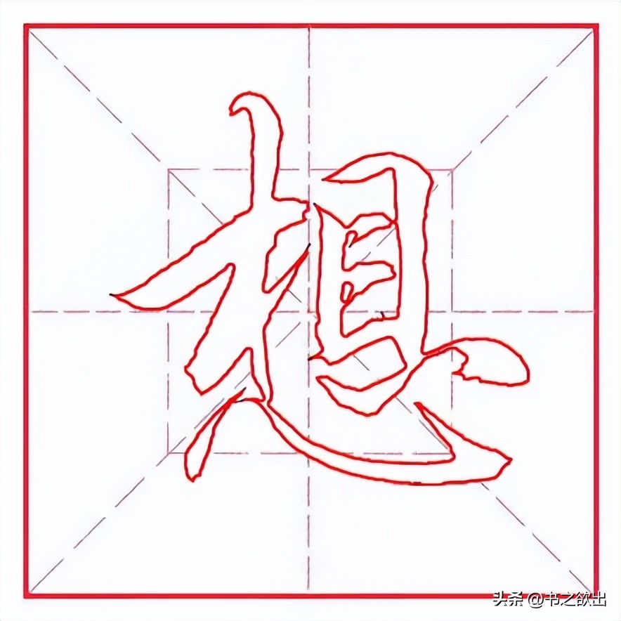 “目”字左竖起笔与左横收笔的上沿基本平齐,距离勿远,稍带弧度;横折与左竖虚接,横画抗肩,勿重,行笔到位后稍提锋顿笔向下内擫写右竖,竖身稍重,稍长,与左竖略呈相背之势;中间两个短横抗肩角度一致,底横实接两竖,且间距相等。