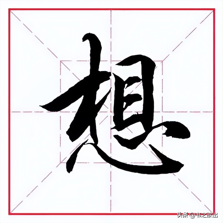 “木”部整体斜势抗肩,不要写宽。首横以露锋斜切入笔,然后向右大抗肩上行,圆收;竖笔高起,角度略平,然后转中锋向下直行,向下行笔略轻,从横画的右部贯穿而过,收笔垂露,勿重;撇笔位于横与竖的相交处从竖画里面起笔,撇身稍直,出锋不要超过首横的起笔;右边点笔从竖身里面带出,略平,勿大。
