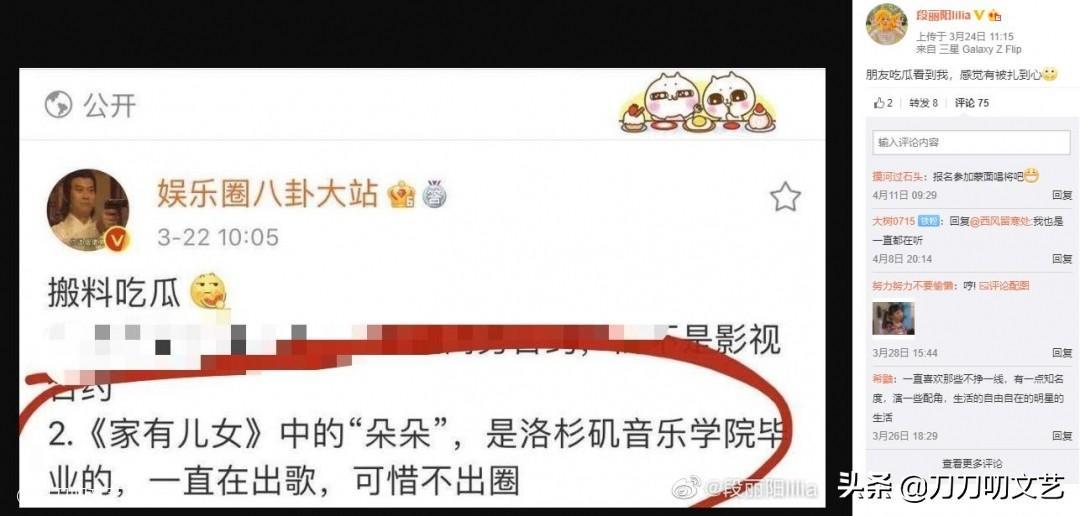 感觉她还挺享受这种状态的,之前有媒体爆料“朵朵一直在出歌,可惜不出圈”,段丽阳还发微博自我调侃“感觉有被扎到心”。