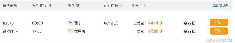 西宁到太原南只要8小时08分钟。一等座票价为523元,二等座票价为411元
