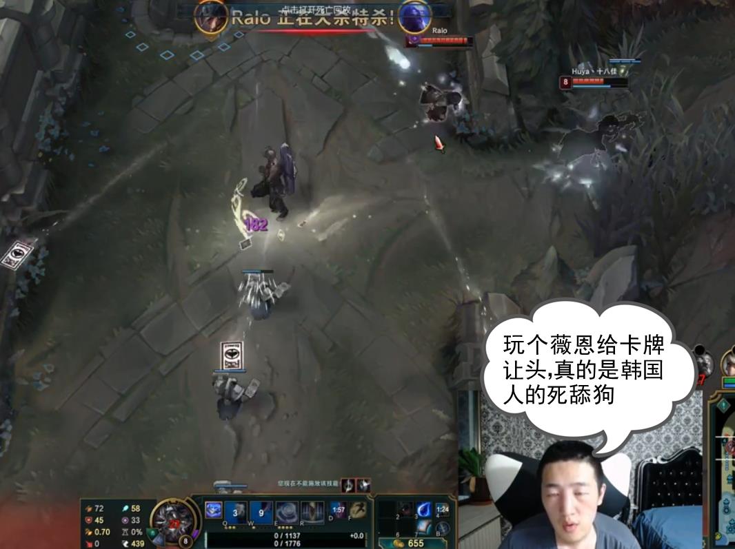 复活后,蛋糕快马加鞭赶到线上,谁料,上线没多久,这个中单薇恩又是再度来到上路,直接包三角草绕后,越塔将蛋糕击杀,而且最后人头依然让给了DOPA。连番针对也让蛋糕感到很郁闷,尤其是薇恩让人头的举动更是让蛋糕很生气,直言给韩国人当狗就这么香?一个薇恩给卡牌让人头?