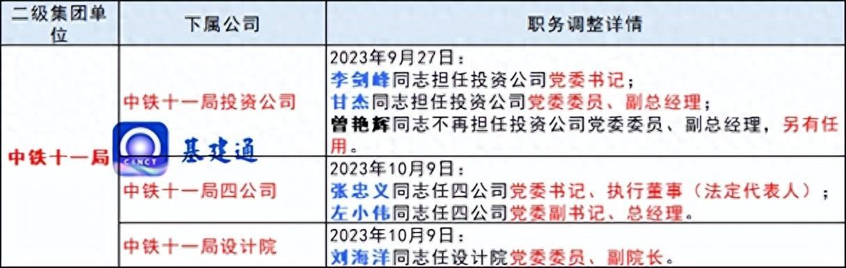 9 月 27 日至 10 月 9 日,中铁十一局下属 3 家子公司中铁十一局投资公司、四公司、设计院相继召开干部大会,宣布了公司领导班子调整任免决定。具体如下: