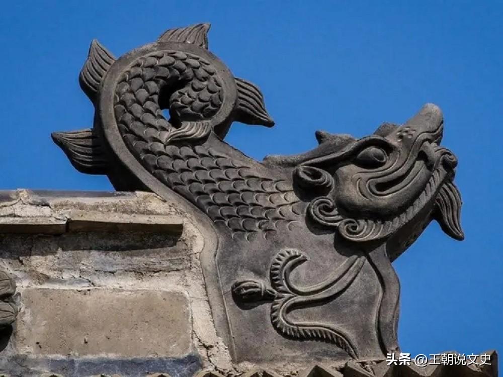 相传螭吻是龙和美人鱼所生,所以它有着龙的脑袋和鱼的身体。细心的朋友会发现,在一些比较古老的房子屋顶上会见到龙头鱼身的石雕。