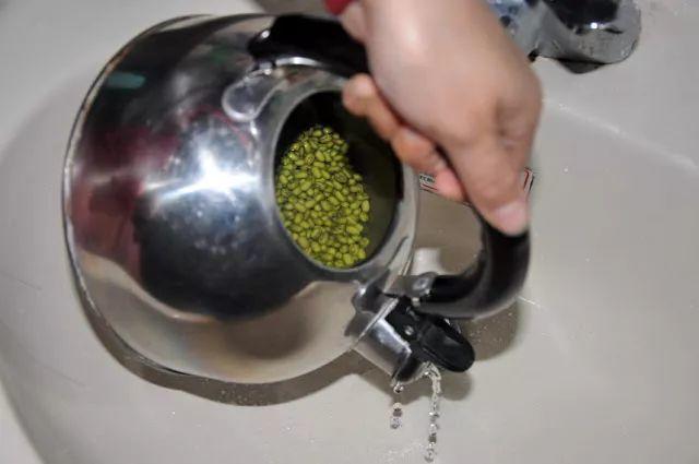 2、把绿豆芽装到水壶里,注意要提前把水壶清理干净。把水壶里倒上水,清洗一下豆子,然后倒掉。