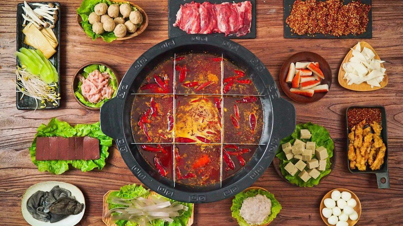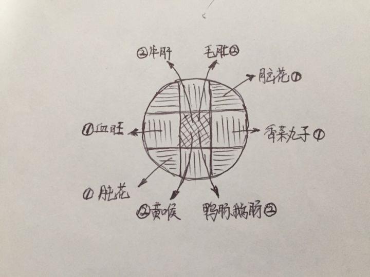 我们要做的是把块状的肉食先放入几个边上的格子里。这种肉食需要久煮,但是不用大火滚汤,比如:香菜丸子、肫花、脑花、血旺。这里有一个例外——老肉片。老肉片顾名思义一定要煮老了才好吃,所以我们从一开始就把它扔下锅里不管。