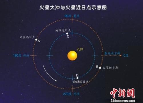北京时间7月27日,在月全食发生的前一天晚上,位于中国的民众也有机会欣赏到“火星冲日”的天象奇观。“火星冲日”是指:火星和太阳分别位于地球的两侧,且三者排列成大致一条直线,这时的火星距离地球比平时相对更近一些,从地球看过去,火星会更加明亮。由于这次火星距离地球相对来说非常近,看起来又大又明亮,可以说是火星的一次“大冲”。而此后的整个8月也都将是2018年整夜观测火星的最佳时机。