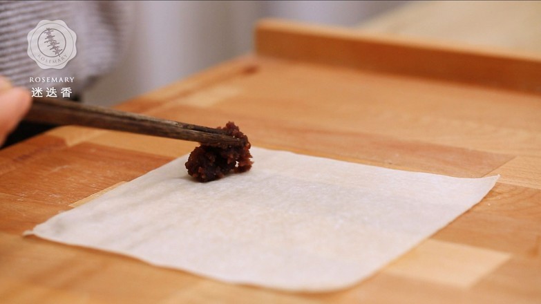 1.在春卷皮一端放上豆沙