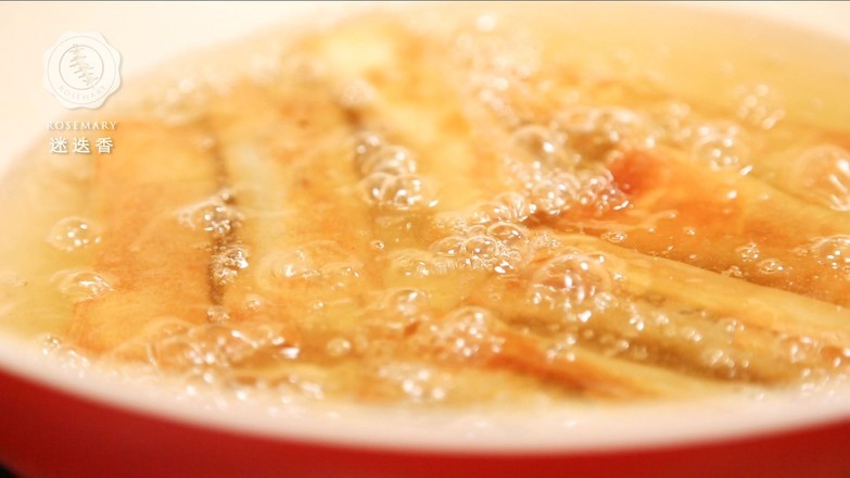 6.炸至表皮呈金黄色,夹出放在吸油纸巾上吸去多余的油分即可