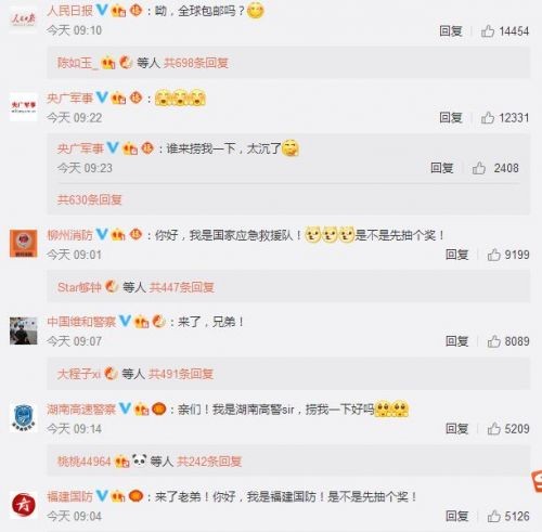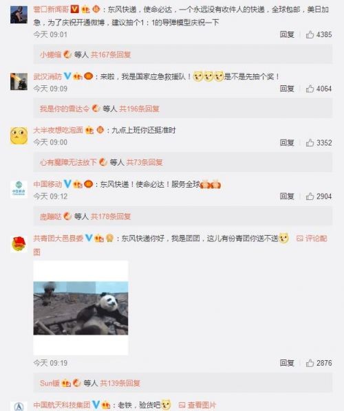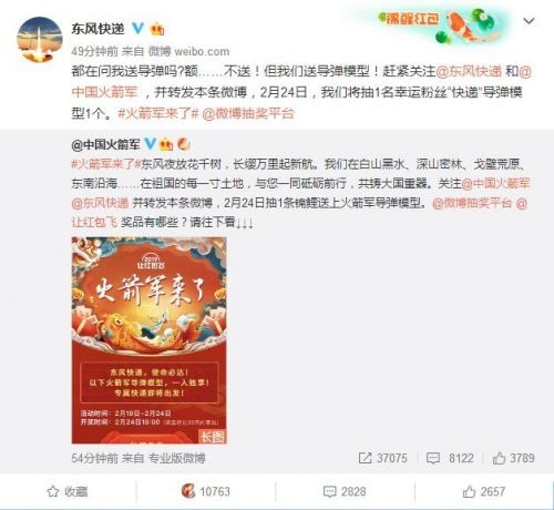 我们可以看到,中国火箭军账号今日发布了一条抽奖微博,东风快递账号进行了转发,还另外发布了一条微博:东风快递,即日开始“营业”。东风快递的这条微博引起各方“大佬”的围观: