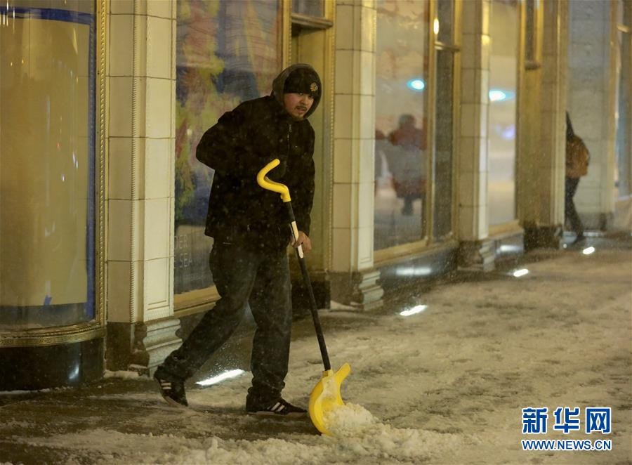 1月17日,在美国芝加哥,一名男子在街头除雪。 美国芝加哥当日遭暴风雪袭击,地面积雪严重,影响交通和出行。 新华社记者 汪平 摄