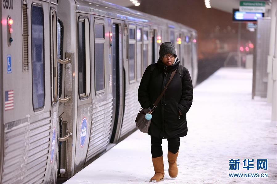 1月17日,在美国芝加哥,一名女子在地铁站台上行走。 美国芝加哥当日遭暴风雪袭击,地面积雪严重,影响交通和出行。 新华社记者 汪平 摄