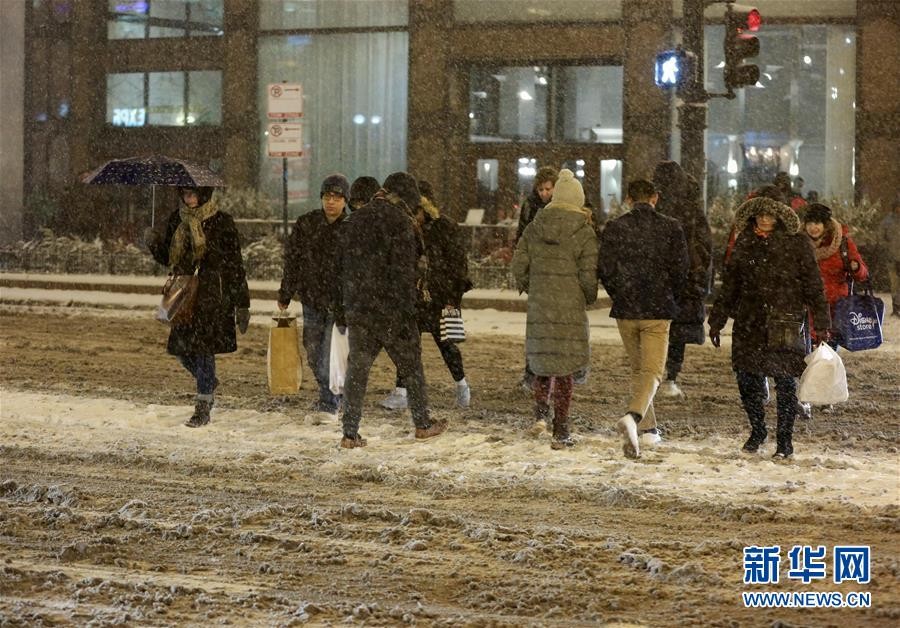 1月17日,在美国芝加哥,行人冒雪出行。 美国芝加哥当日遭暴风雪袭击,地面积雪严重,影响交通和出行。 新华社记者 汪平 摄