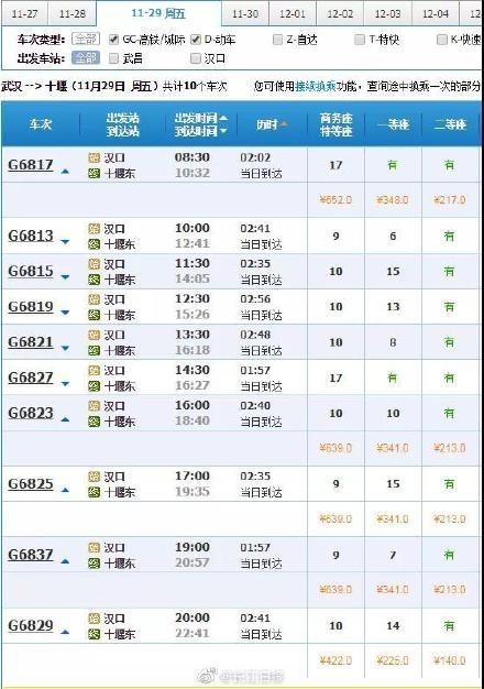 汉十高铁29日开通运营【武汉至十堰高铁票价出炉!全程票价最低140元(附票价时刻表)】真的来啦!被称为“湖北最美高铁”的汉十高铁刚刚开始售票,将于11月29日开通运营!线路途经孝感、随州、襄阳、十堰4个地市和17个县市区。线路全长399公里,最高设计时速350公里,共设孝感东、朋兴(预留车站)、云梦东、安陆西、随州南、随县、枣阳、襄阳东、隆中(暂不办理客运业务)、谷城北、丹江口、武当山西、十堰东等13座车站,初期运营时速300公里。汉十高铁开通运营初期,铁路部门将安排开行动车组列车30对,十堰至武汉最快运行时间1小时57分,到襄阳1小时,到随州仅半小时。(长江日报)