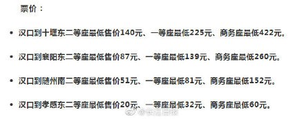 武汉至十堰高铁票价出炉!全程票价最低140元