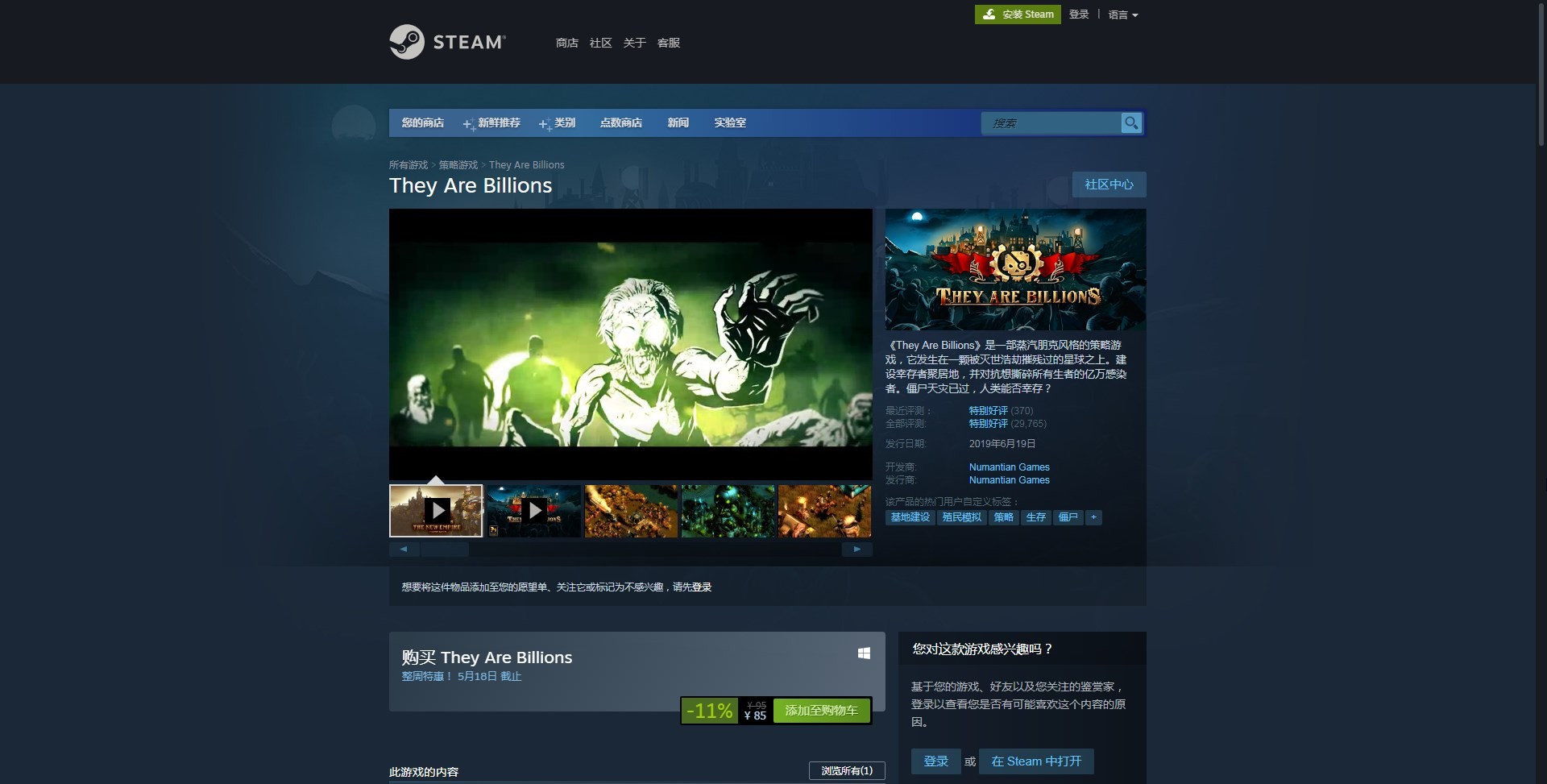 《亿万僵尸》这款游戏在steam平台上的名字叫they are billions,直接搜索亿万僵尸是找不到游戏页面的
