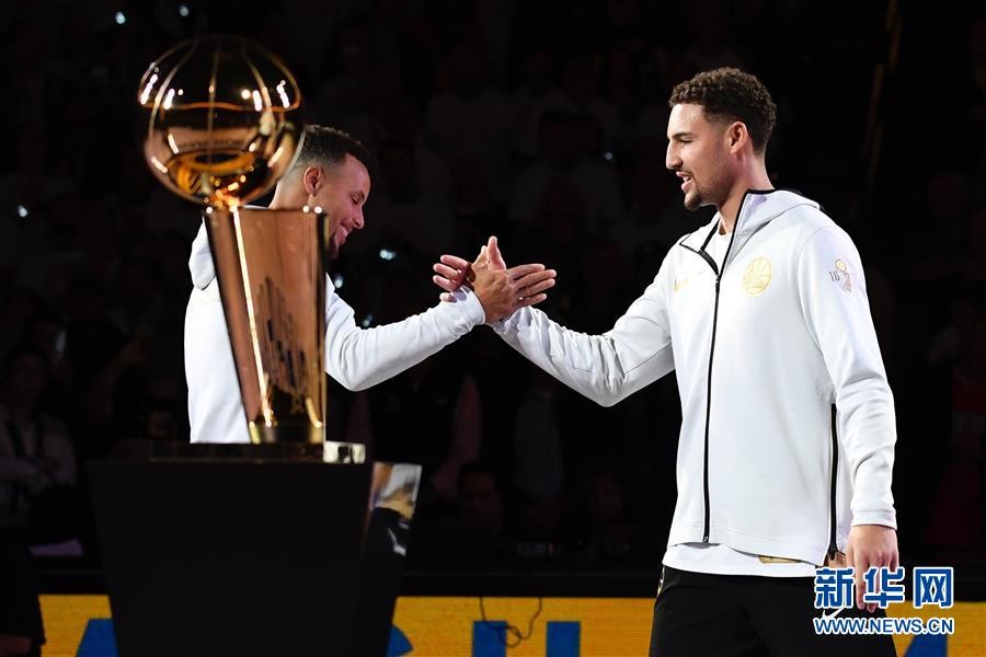 ↑10月17日,勇士队球员库里(左)与汤普森在赛前的上赛季冠军戒指颁发仪式上击掌。 新华社/路透