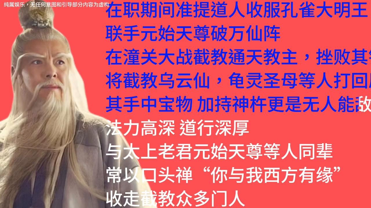 其手中宝物加持神杵更是无人能敌,法力高深,道行深厚,与太上老君、元始天尊等人同辈,常以口头禅"你与我西方有缘",收走截教众多门人。