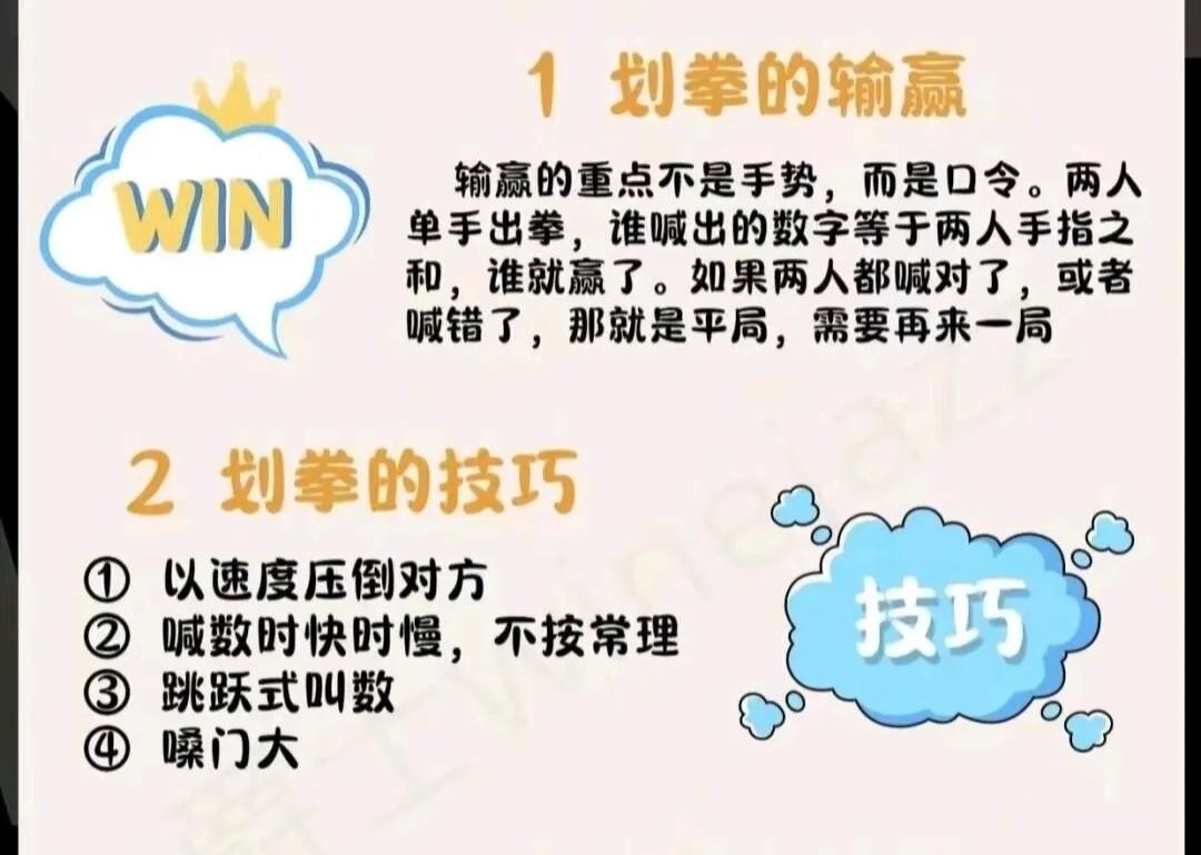 划拳起源于汉代,又叫猜枚、猜拳、猜码、是中国民间饮酒时助兴取乐的游戏。划拳不仅可以增添酒兴,烘托喜庆,而且因其技性、竞争性颇强,给玩者留有斗志的余地。