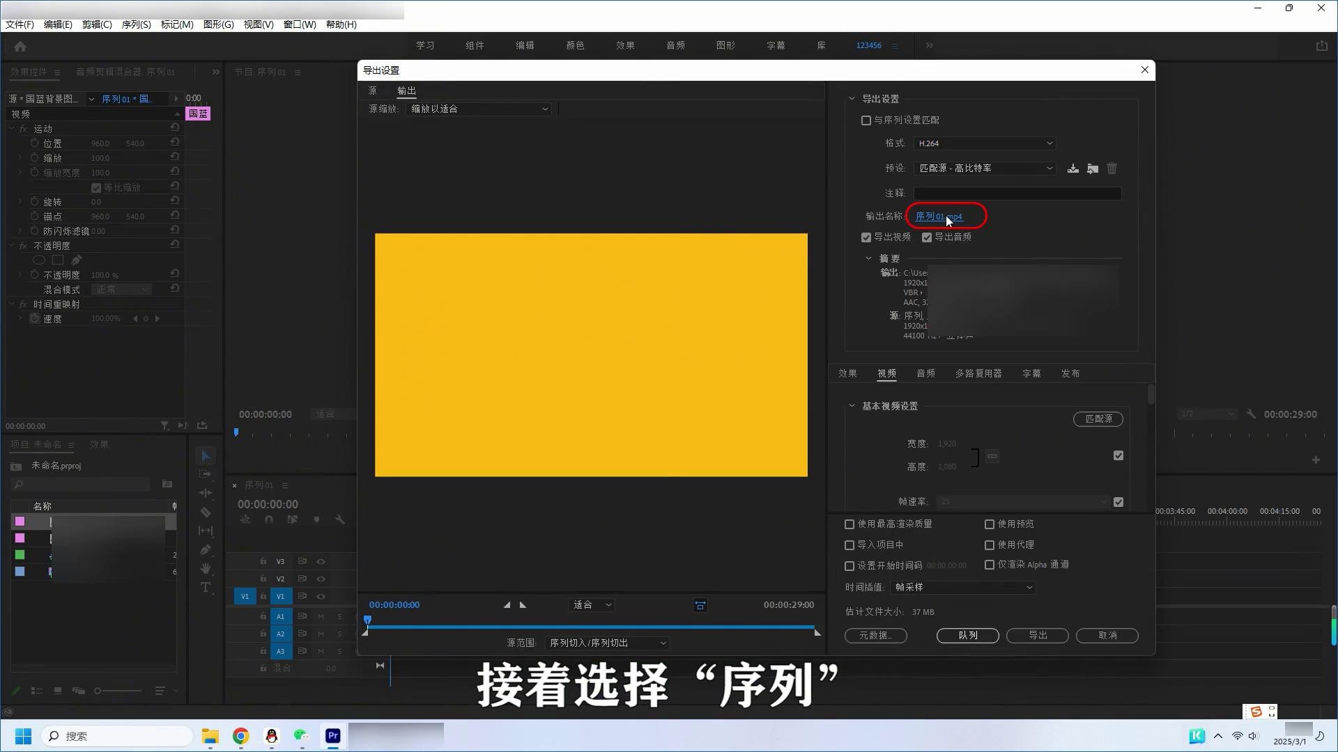 ·打开pr文件点击"导出"→选择"媒体"→选择"序列"→重命名序列名称选择文件夹,点击"保存"→点击右下方的"导出"等待导出完成即可。