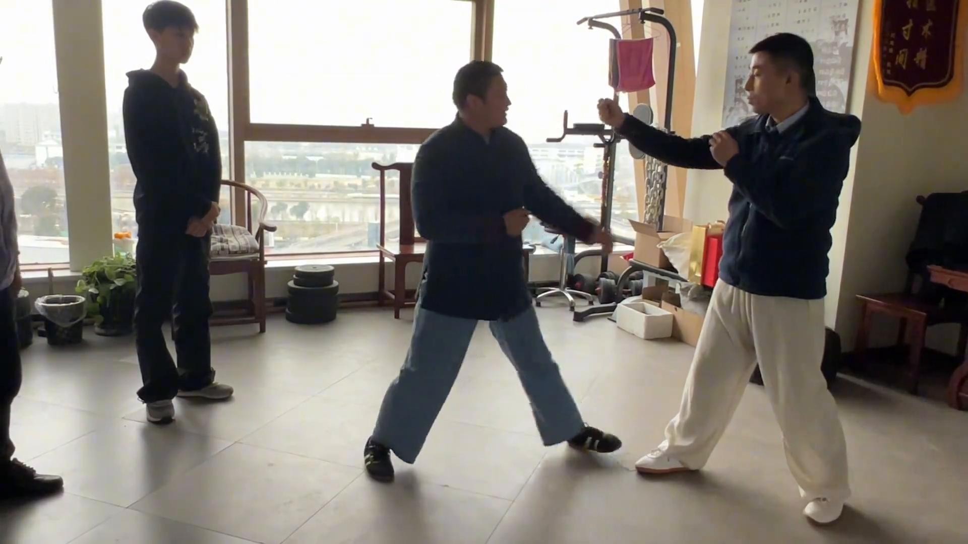 所以所有的动作都是这样做的,是在脸面前走,过来是平安,六分治病也要冲脸这里走,因为从面前防护脸的时候都是从这里走,手都伸太远了,人家打你的时候这有空挡,手不能伸那么远,两加一也不能看,很多人打的手伸那么长,这样过来,太远了。