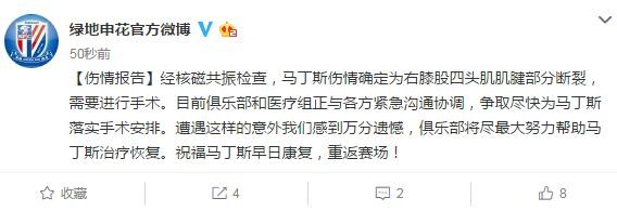 经核磁共振检查,马丁斯伤情确定为右膝股四头肌肌腱部分断裂,需要进行手术。目前俱乐部和医疗组正与各方紧急沟通协调,争取尽快为马丁斯落实手术安排。遭遇这样的意外我们感到万分遗憾,俱乐部将尽最大努力帮助马丁斯治疗恢复。祝福马丁斯早日康复,重返赛场!