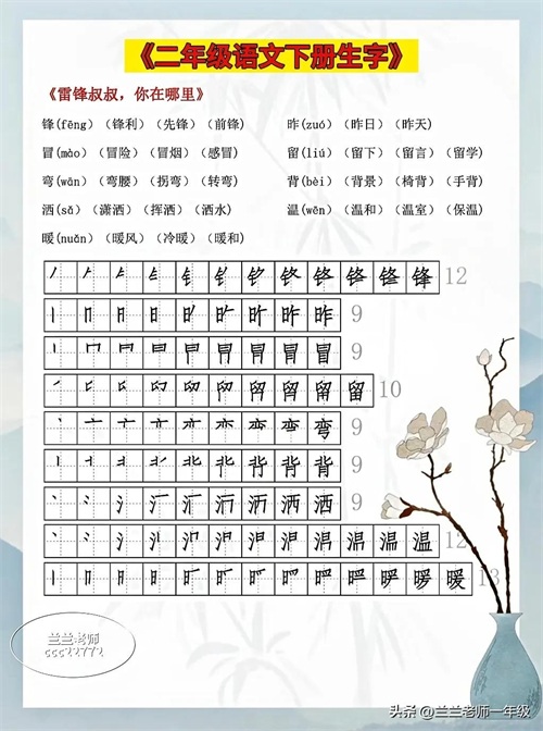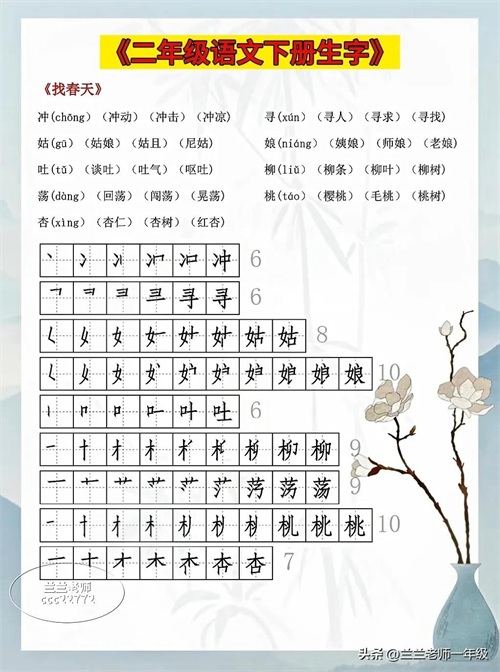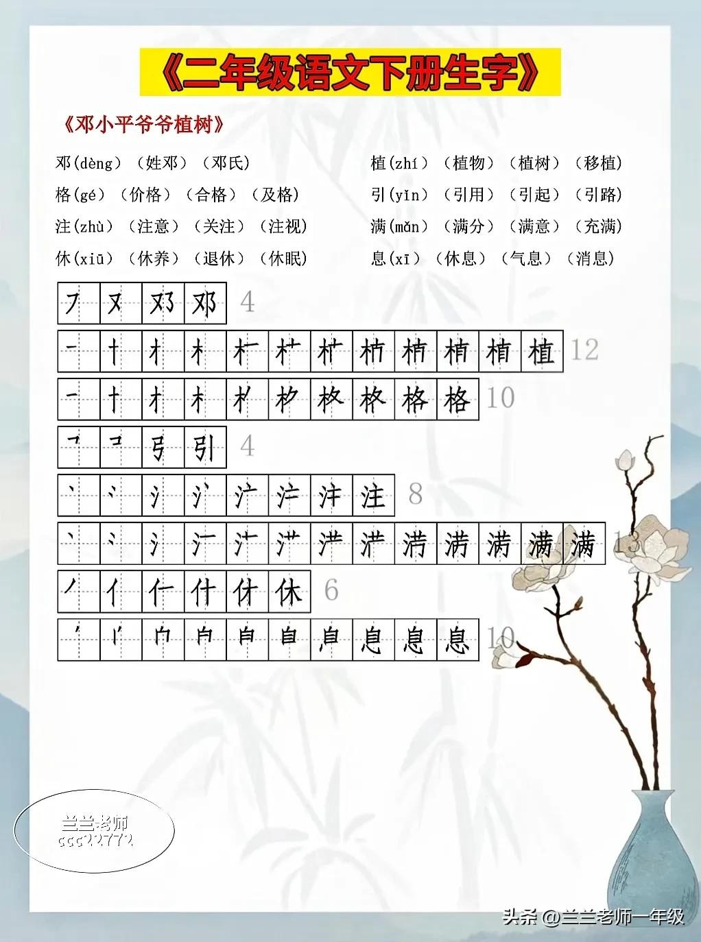 二年级语文下册生字表老师都整理好了,包含了拼音组词笔顺