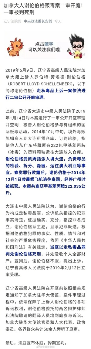 刚刚!加拿大人谢伦伯格走私毒品案二审开庭 一审被判死刑