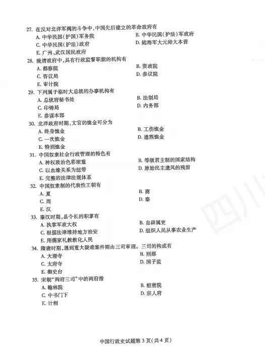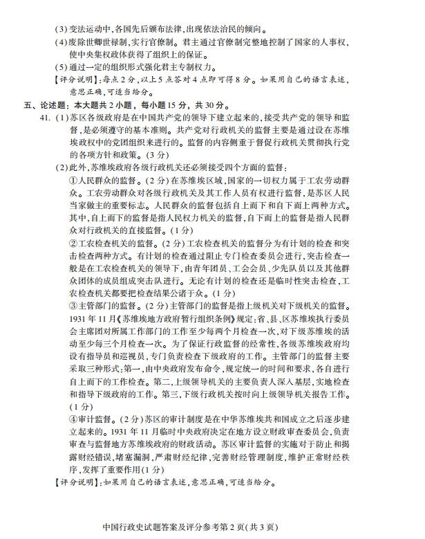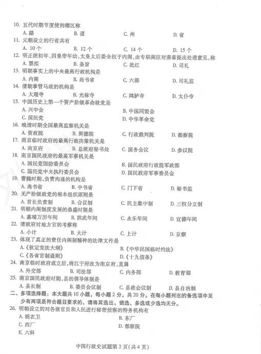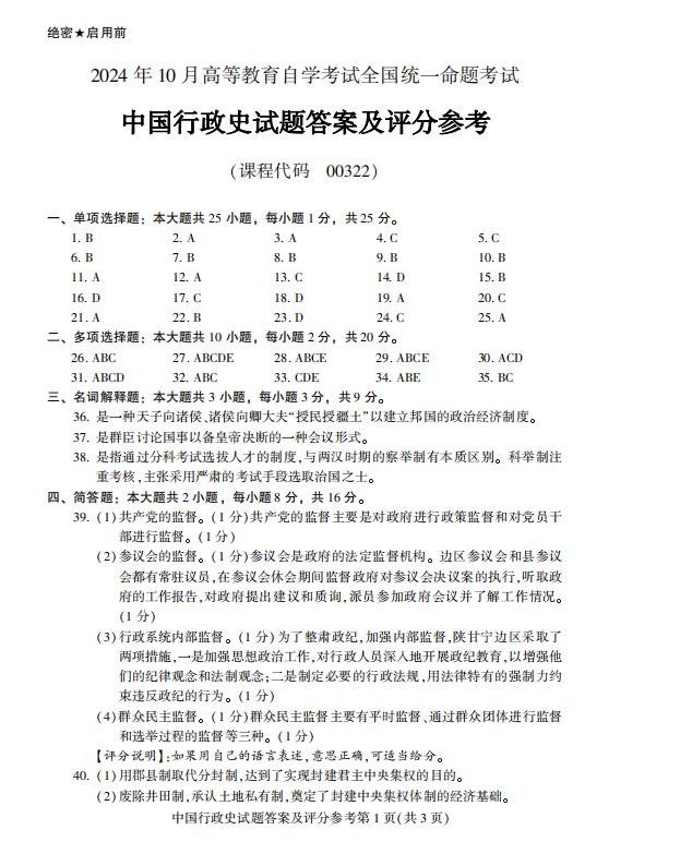 2024年10月自考真题和标准答案|00322中国行政史