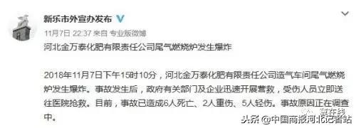 据河北省石家庄新乐市外宣办官方微博消息,2018年11月7日下午15时10分,河北金万泰化肥有限责任公司造气车间尾气燃烧炉发生爆炸。事故发生后,政府有关部门及企业迅速开展营救,受伤人员立即送往医院抢救。