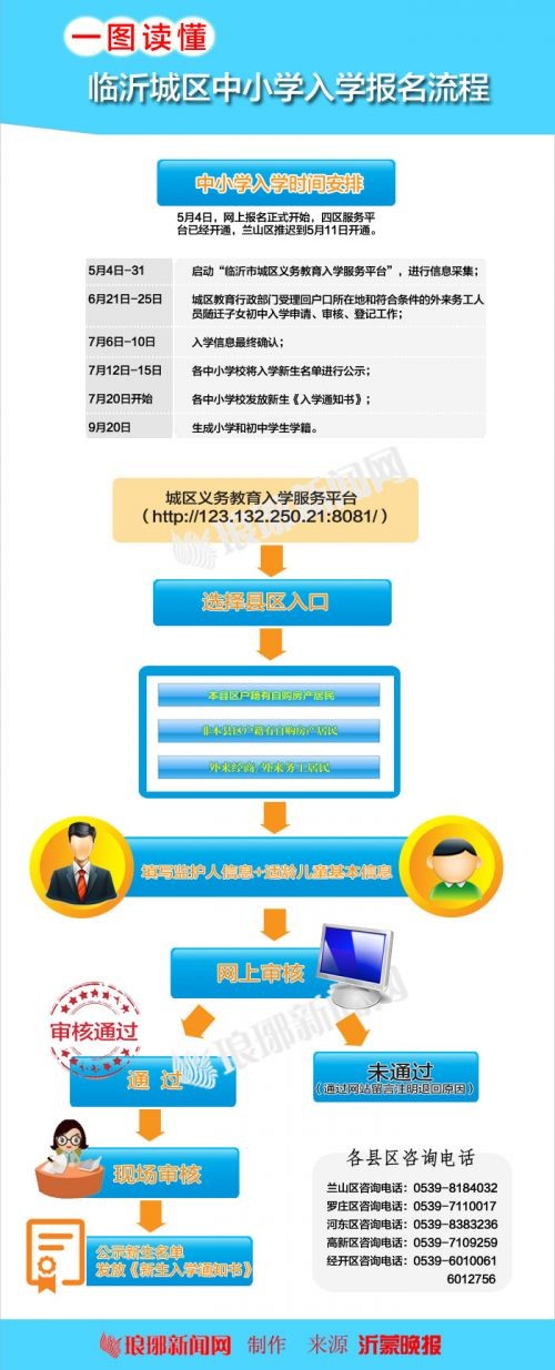 今年临沂城区中小学入学首次采用网上报名,4日,临沂市教育局正式开通城区义务教育入学服务平台(http://123.132.250.21:8081/),家长在申报学区内学校时,只要登录平台填写基本信息后,在各区规定的时间内便可查询到是否通过审核。由于兰山区平台还在测试中,所以该区的服务平台将推迟到5月11日开放。