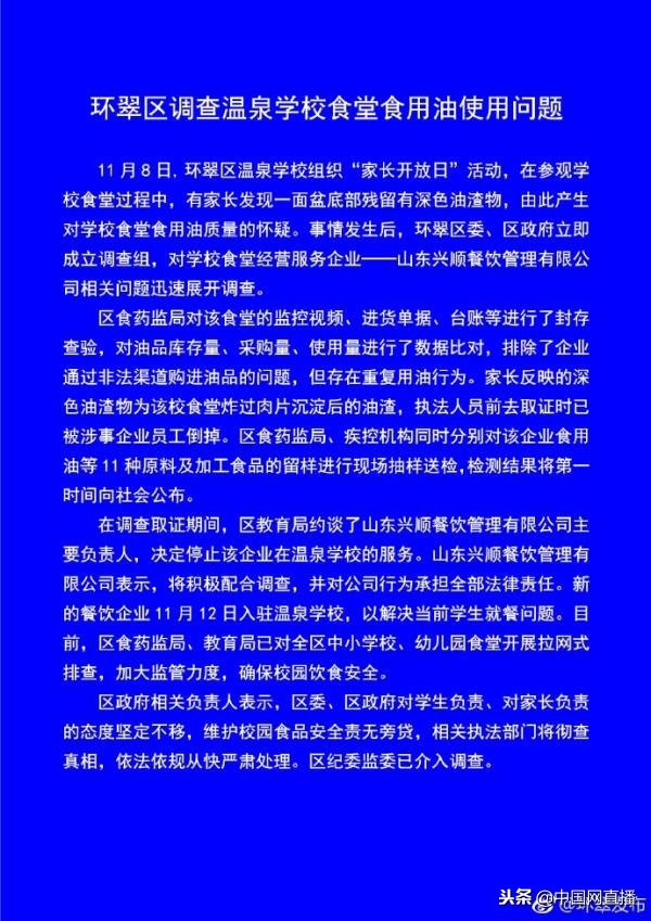 威海通报“小学食堂重复用油”:校长停职调查,教师轮流陪餐