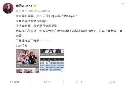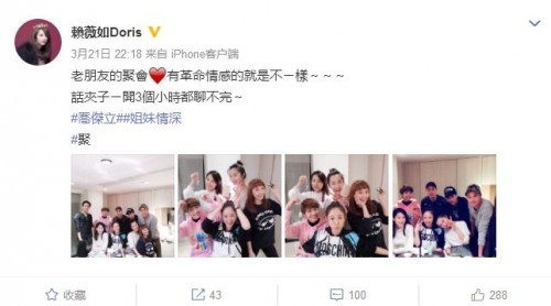 21日晚,台湾女星赖薇如微博晒出一组图片,图片中是七朵花成员的聚会照,并配文称:老朋友的聚会❤️有革命感情的就是不一样!话匣子一开3个小时都聊不完。