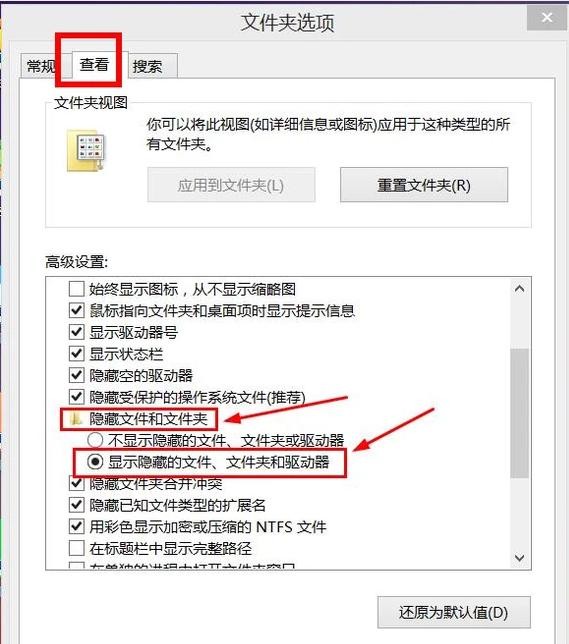 出现对话框后,点击对话框中的“查看”,将高级设置中的“隐藏文件和文件夹”里面的“显示隐藏的文件、文件夹和驱动器”即可找到被隐藏的文件了。