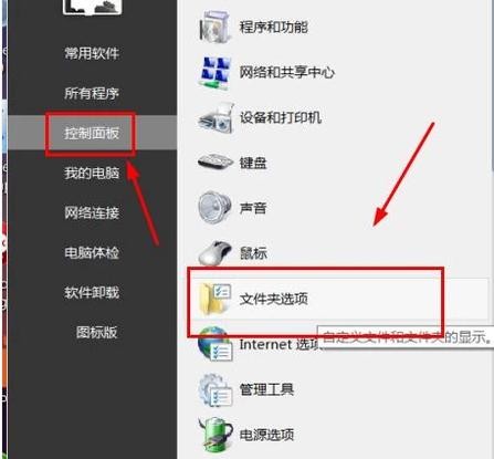 打开“菜单”,点击“控制面板”,选择“文件夹选项”。