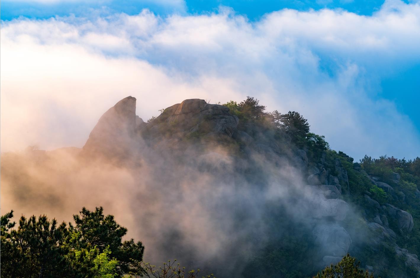 清晨,奇石、怪松沐浴晨曦,庄严静谧;雨后,它们掩映于氤氲云海,与清脆鸟鸣、潺潺溪流相映成趣,让人恍如仙境,美不胜收。(聂建武/文 韩家东/图)