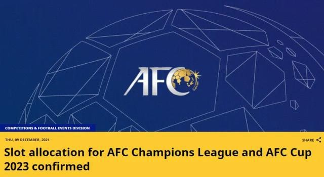 亚足联官方确认:2023赛季亚冠联赛中超名额减至2+2个