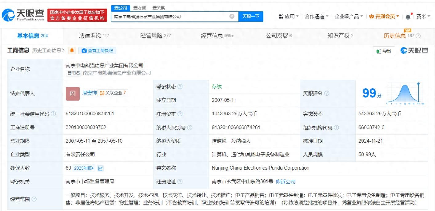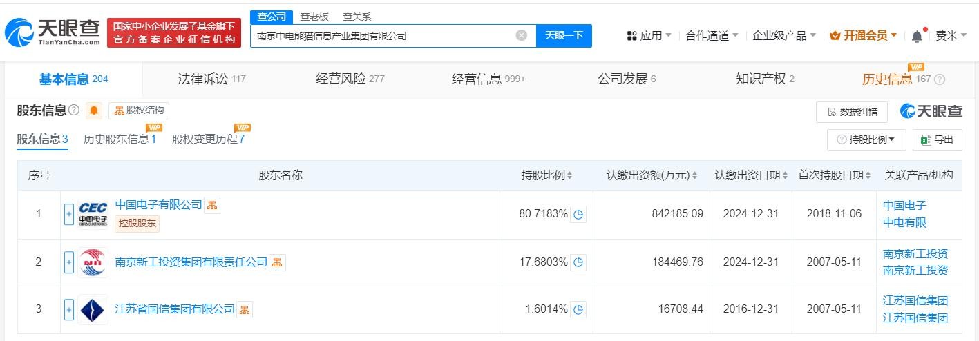 南京中电熊猫信息产业集团有限公司成立于2007年5月,法定代表人为周贵祥,经营范围含电子产品销售、电子元器件制造、电子元器件批发、电子专用设备制造、电子专用设备销售、非居住房地产租赁等,由中国电子有限公司、南京新工投资集团有限责任公司、江苏省国信集团有限公司共同持股。