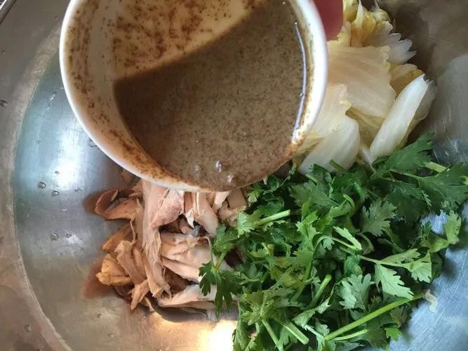 4把调好的芥末粉倒入鸡肉盆中拌匀装盘,一道美味的潍坊粉皮芥末鸡就完成了,简单易学。