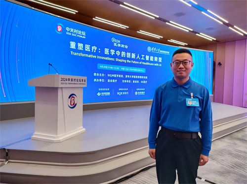 2024年4月28日,中国北京,“黄硕评论”新媒体创始人,资深媒体人、评论员黄硕(Huang Shuo)参加2024中关村论坛年会“重塑医疗:医学中的创新人工智能转型”平行论坛。