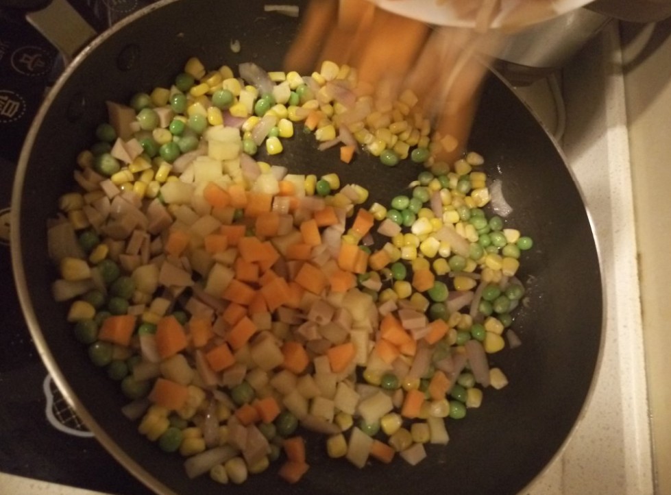 放入洋葱爆香。在放入红萝卜青豆玉米香肠-起炒。