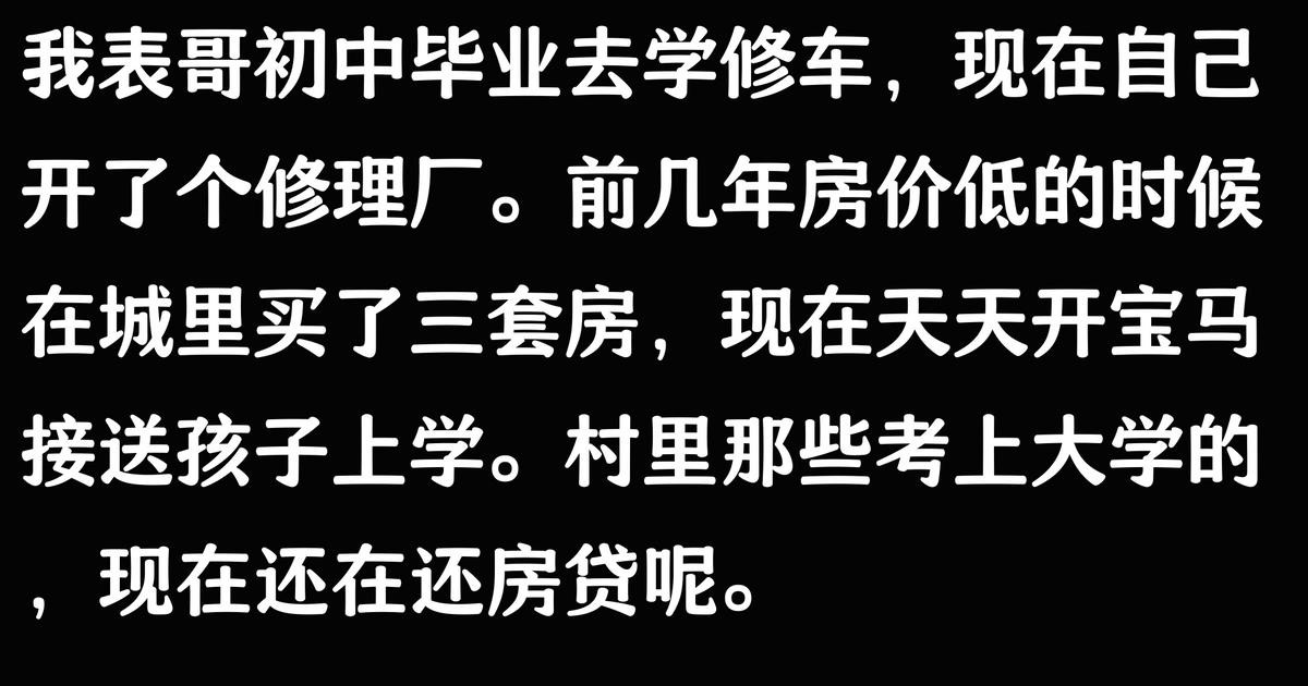 我表哥就是学修车的,现在自己开了个修理厂。当初家里人都说读书才有出息,现在他生意做得红火,买了房买了车,比我们这些上班的强多了。手艺这东西真是越老越吃香,后悔当初没跟着他学。