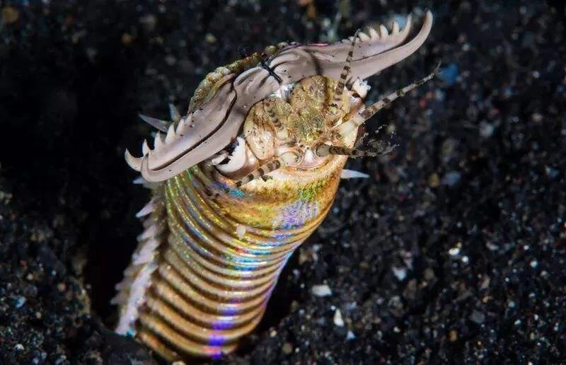 这种虫子平均体长1米,最长可达3米。不过平时看到的经常是它只露出的头部(没有眼睛和大脑)。它擅长伏击,将自己的身子埋在海底的沙子中,守株待兔。根据科学家的研究,博比特虫的捕食器十分复杂,有5个触角,一对大颚和口启组成,被称为“咽头”。它用5个触角探测环境,每当触须被碰到,博比特虫就像鱼雷一样冲出洞穴,并在瞬间将整个口腔翻出,暴露出像剪子一样的上下颚,攻击过程猛而快,小鱼一下被咬成两半,然后,猎物会被拖到沙子下面,防止逃脱。对猎物来说,过程倒是很痛快。