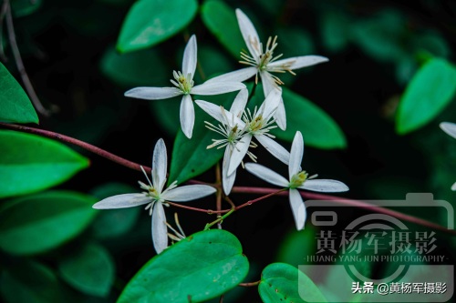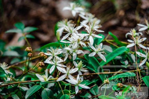 沿着威灵仙长藤一朵朵花开其间。绿叶中的娇小花朵很美。