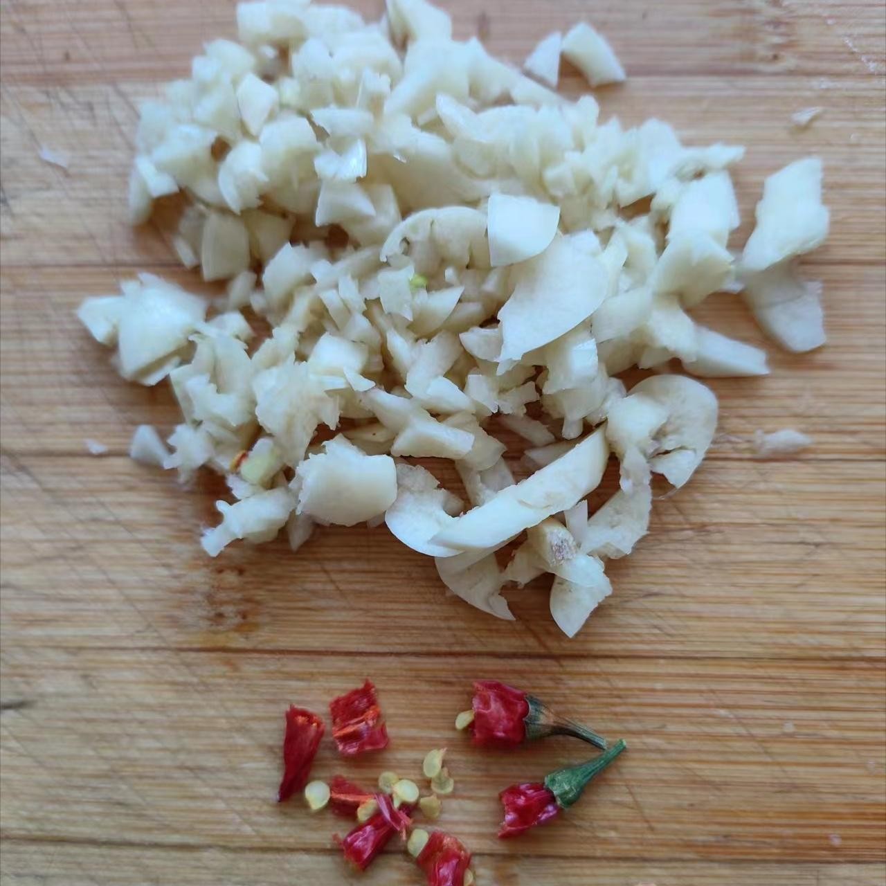 4.起锅,凉油放入蒜末、辣椒,炒至蒜末微黄。 放入面酱或豆瓣酱继续炒,再放入生抽、糖、蚝油。加适量水烧开。