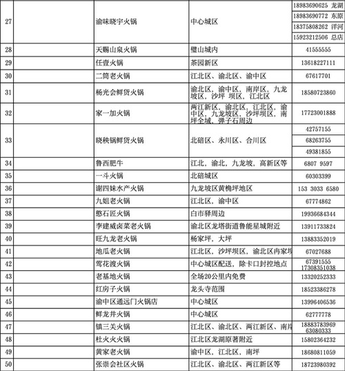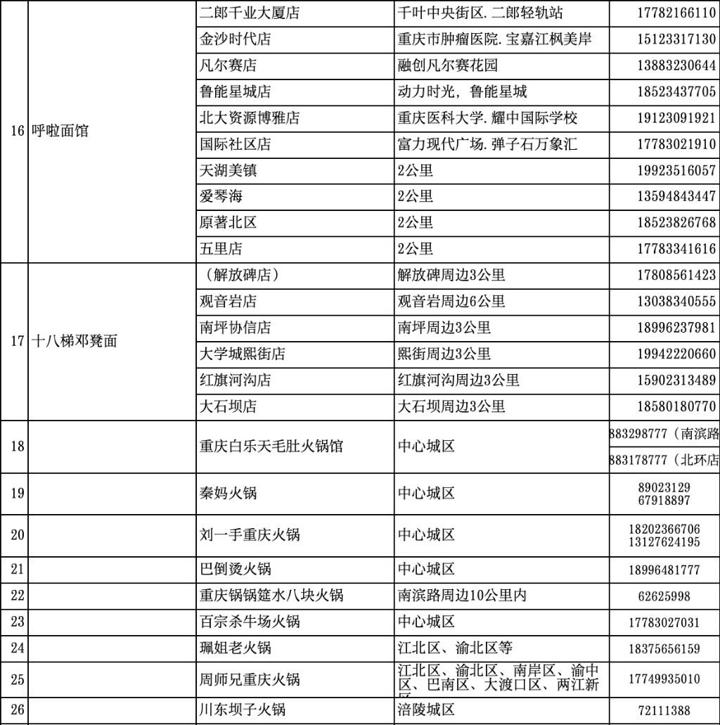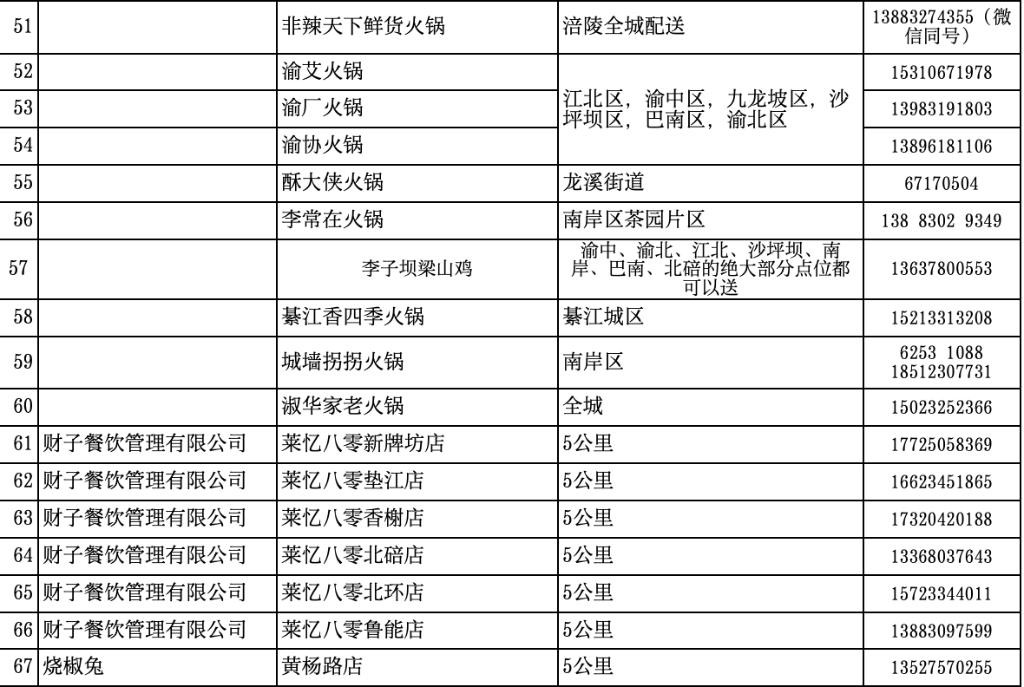 华龙网-新重庆客户端讯(首席记者 董进)11月17日,重庆市商务委搜集发布了67家可以送外卖的餐饮商家门店名单,还附上附订餐电话,广大市民可收藏。